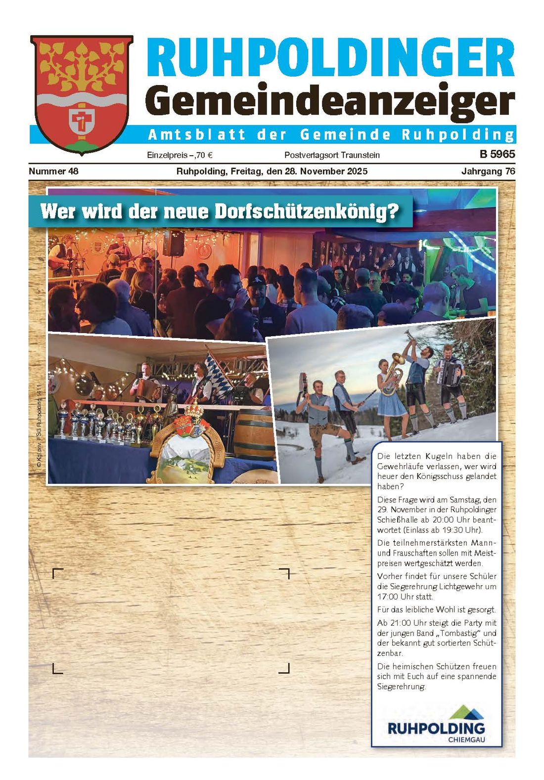 Bei der Erstellung des Ruhpoldinger Gemeindeanzeiger Nr. 48, mit Erscheinungsdatum 28.11.2025 ist dem Wittich Verlag ein Fehler unterlaufen. Die Zeitung wurde mit der Titelseite der Vorwoche gedruckt. Entsprechend sind Datum (21.11.2025), Ausgabennummer (47) und das Bild falsch. Alle weiteren 27 Seiten der Ausgabe inkl. der veröffentlichten Bekanntmachungen entsprechen der Ausgabe Nummer 48 vom 28.11.2025.