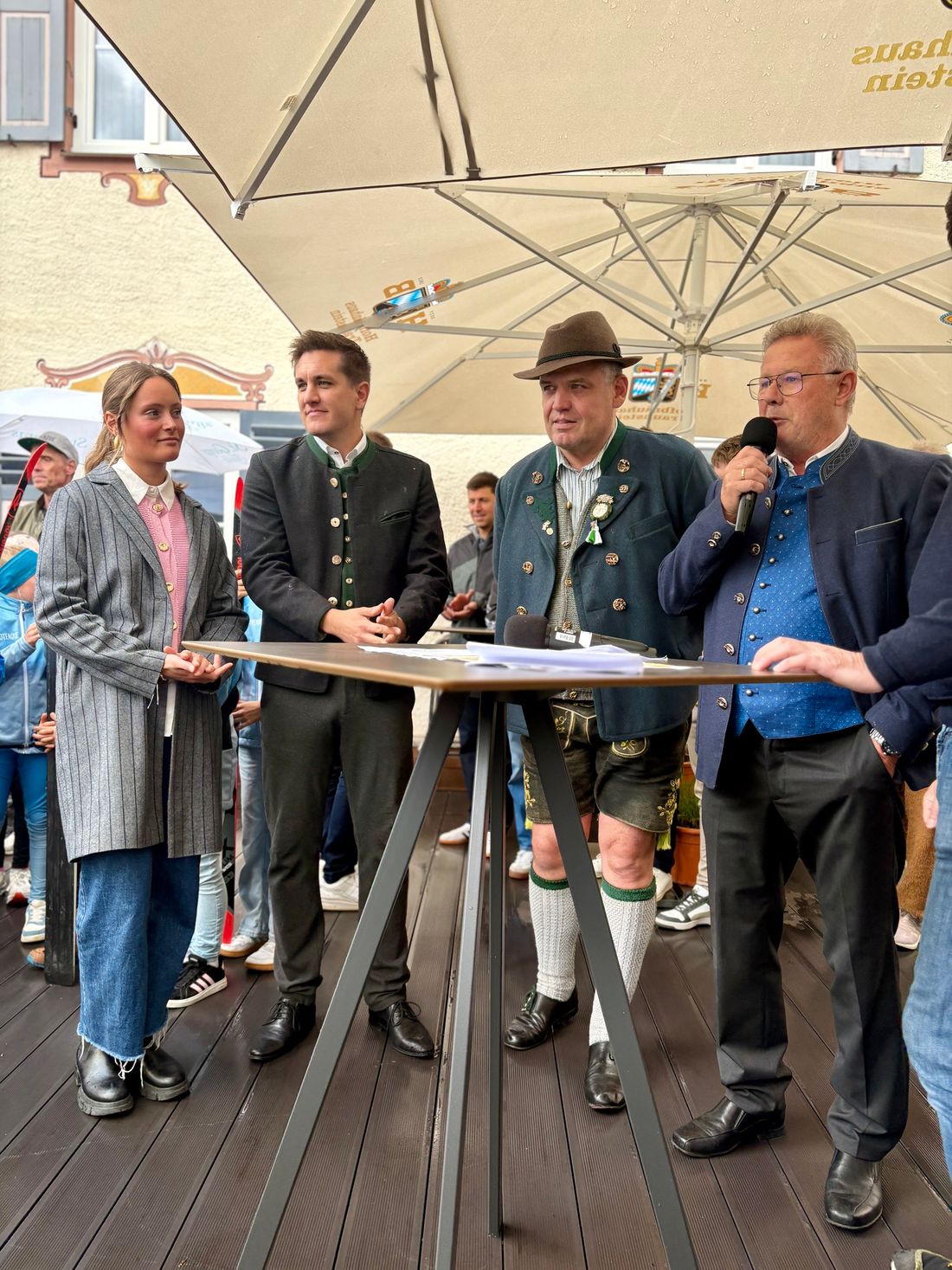 Auf dem Balkon präsentierten sich nicht nur die geehrten Sportler, sondern auch zwei ihrer erfolgreichen Trainer – Damencheftrainer Kristian Mehringer (Biathlon) und Florian Aichinger (Bundestrainer für die Nordische Kombination Damen), deren Arbeit im Hintergrund einen entscheidenden Anteil an den Erfolgen ihrer Schützlinge hatte. Zu den Gratulanten zählten neben Bürgermeister Justus Pfeifer und Ski-Club Vorstand Hermann Feil auch der geschäftsführende Landrat Sepp Konhäuser sowie der heimische Bundestagsabgeordnete Sigi Walch. Gemeinsam überbrachten sie Glückwünsche und sprachen ihren Stolz über die Leistungen der Athleten aus.