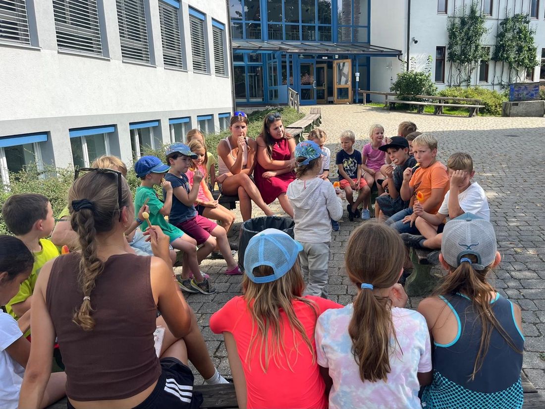 Die pädagogisch geschulten Betreuerinnen sorgten dafür, dass den Kindern in den Ferien nicht langweilig wurde. Sie spielten mit der Gruppe, bastelten und unterstützten die Kinder beim Werken in der Werkhütte. So entstanden viele originelle Werkstücke aus Holz, sowie mit Serviettentechnik gestaltete Windlichter und geknüpfte Freundschaftsbänder. Genug Zeit blieb auch für freies Spielen – ganz ohne Druck und Leistungszwang. Bei etwas wechselhaftem Wetter in den ersten Tagen wurde die Turnhalle zum Spielen und Austoben genutzt. Bei sommerlichen Temperaturen an den folgenden Tagen, waren Spaziergänge zum Spielplatz, zur Urschlauer Ache oder dem Kneippbecken sehr beliebt und sorgten für Abkühlung. Besonders viel Spaß und Erfrischung bereiteten die kleinen, mit Wasser gefüllten Luftballons, die platzen und spritzen, wenn sie auf eine Oberfläche treffen.