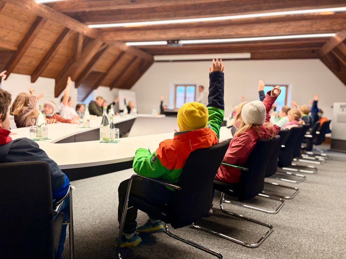Im Sitzungssaal erlebten die Kinder, wie Entscheidungen im Gemeinderat getroffen werden. Eine simulierte Abstimmung machte den Ablauf greifbar: Zunächst sammelten die Schülerinnen und Schüler Argumente für und gegen ein fiktives Projekt, diskutierten darüber und stimmten dann selbst ab. So konnten sie hautnah erleben, wie demokratische Entscheidungen entstehen – und merkten bei jeder Menge Spaß, dass es gar nicht so leicht ist, die begrenzten Finanzmittel richtig und gerecht einzusetzen.