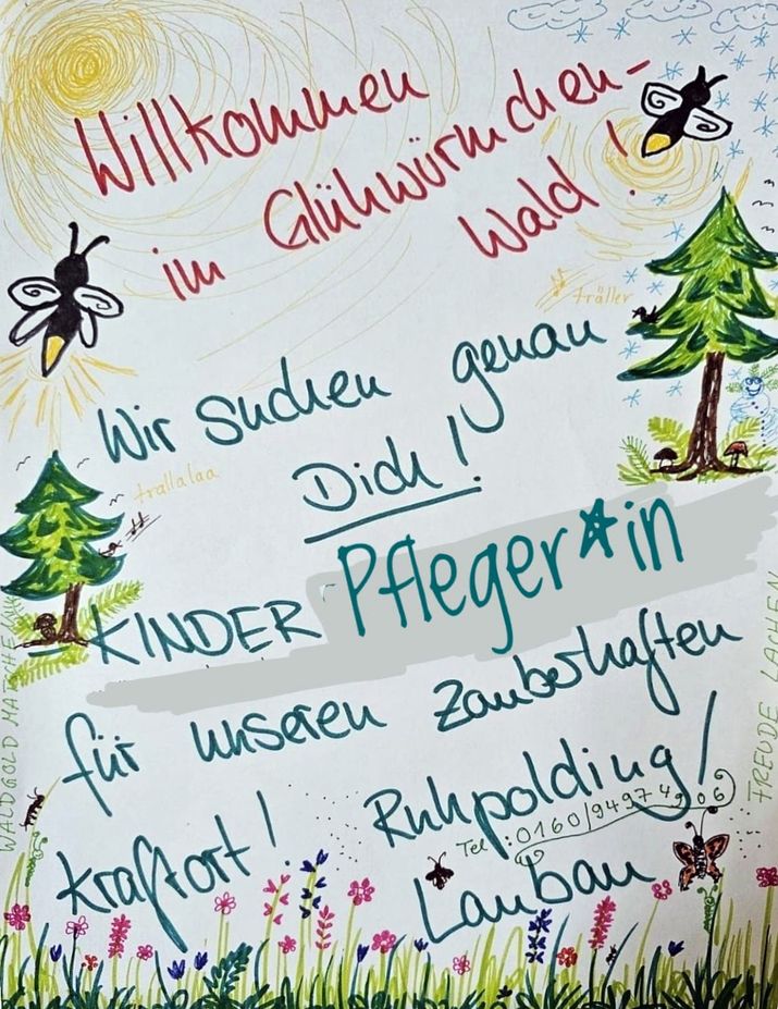 Für unseren Waldkindergarten Glühwürmchen suchen wir eine Kinderpfleger/in (m/w/d) oder Ergänzungskraft (m/w/d), die Kinder gerne draußen begleitet und mit Herz dabei ist.